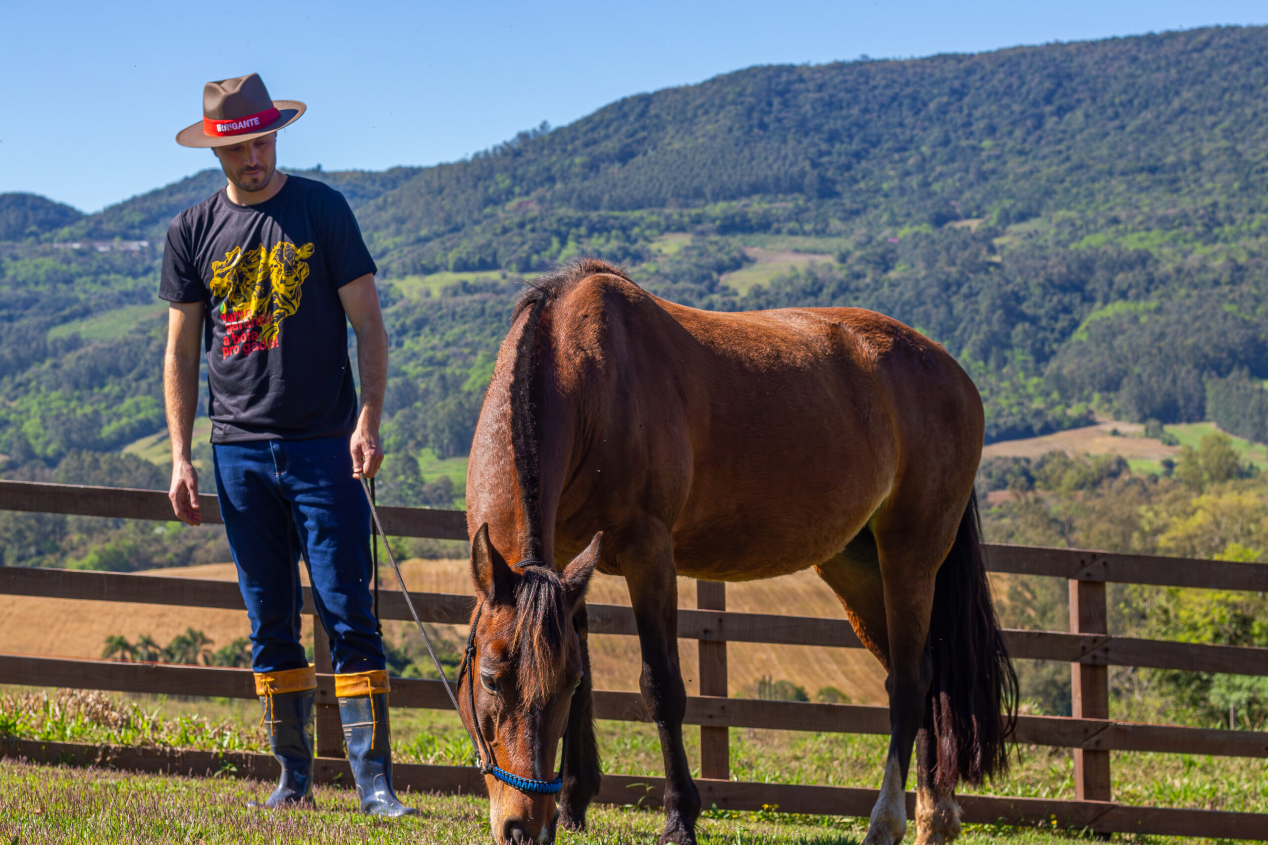 Esta camiseta traz uma arte exclusiva estampando duas cabeças de gado e a frase que é quase um mantra no campo — “Vamo garantir a bóia pro gado!” .