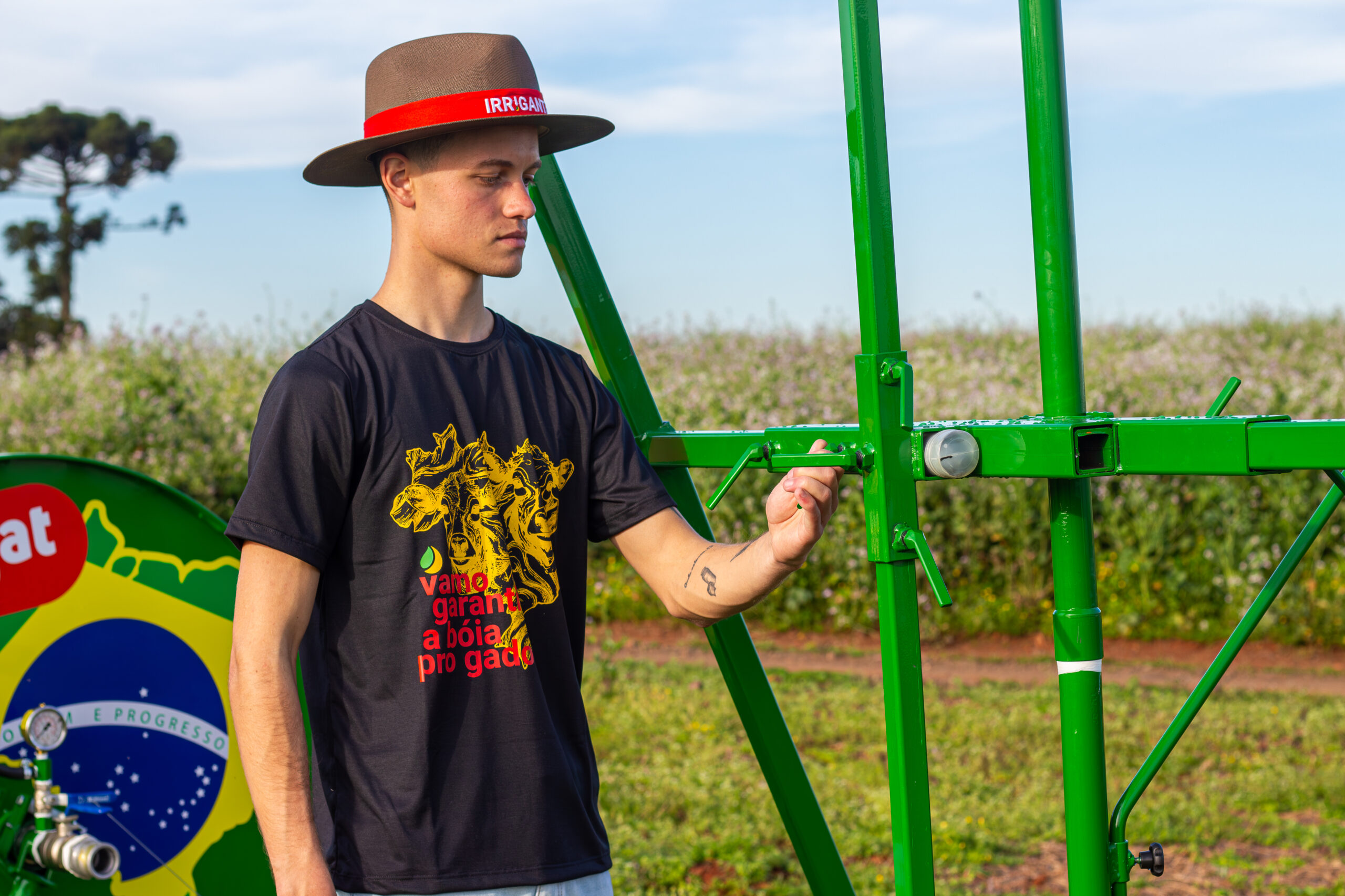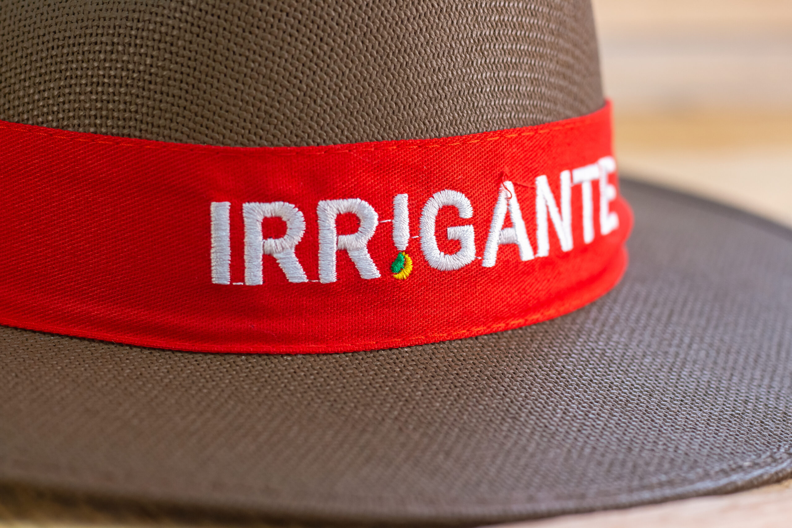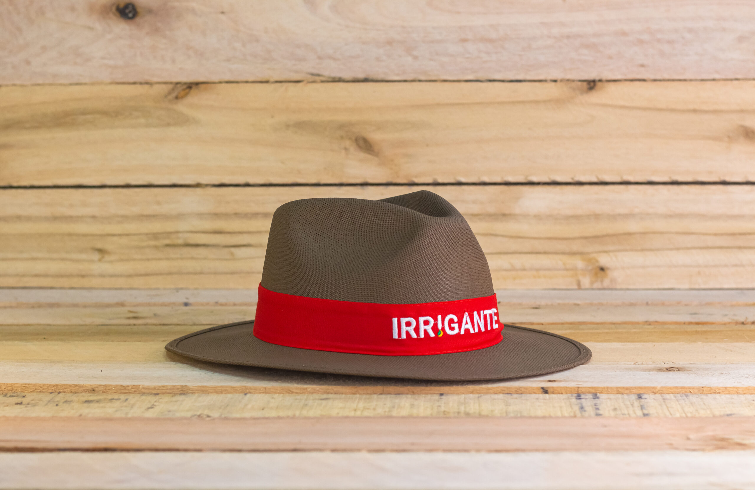 O Chapéu Irrigante, em tamanho único, é confeccionado com lona 100% algodão cru tingido na cor marrom, feito com matéria-prima nacional. Recebe três demãos de resina impermeabilizante.